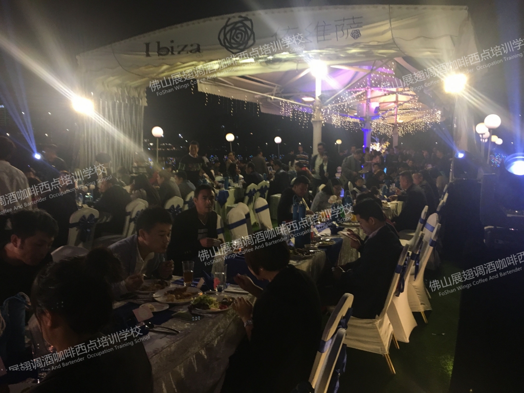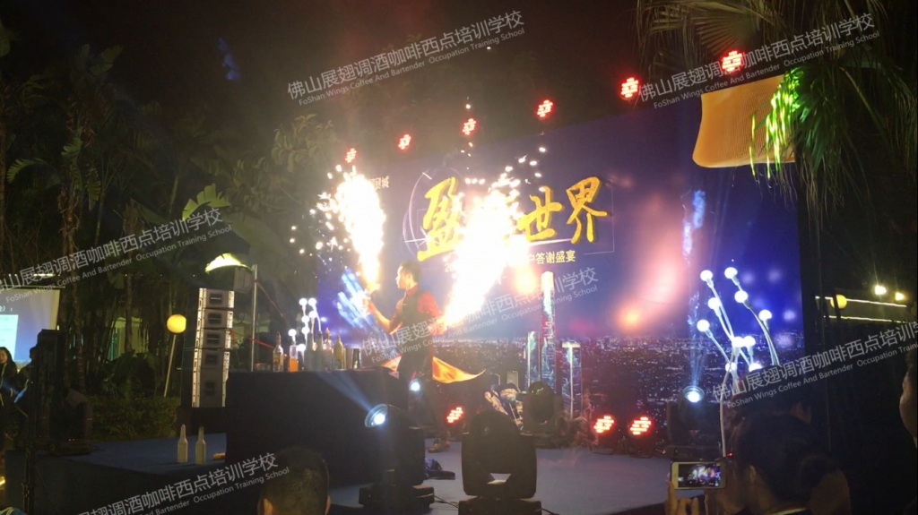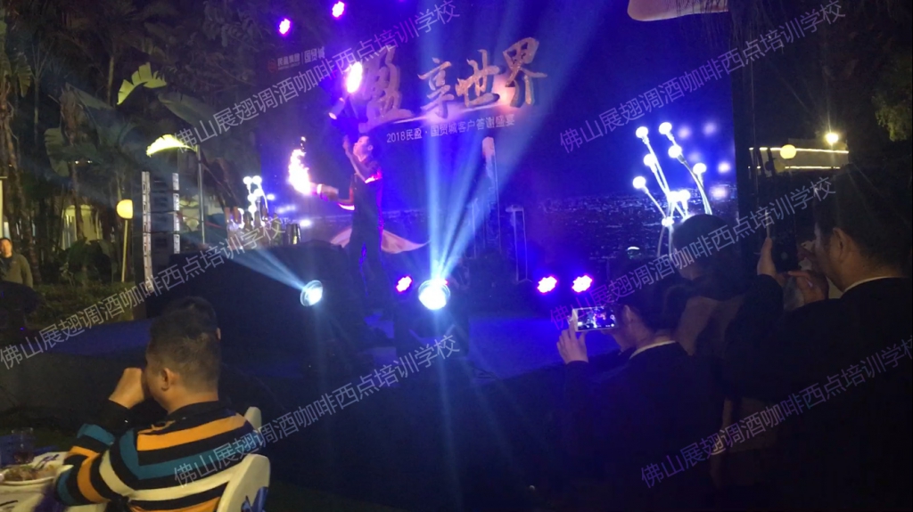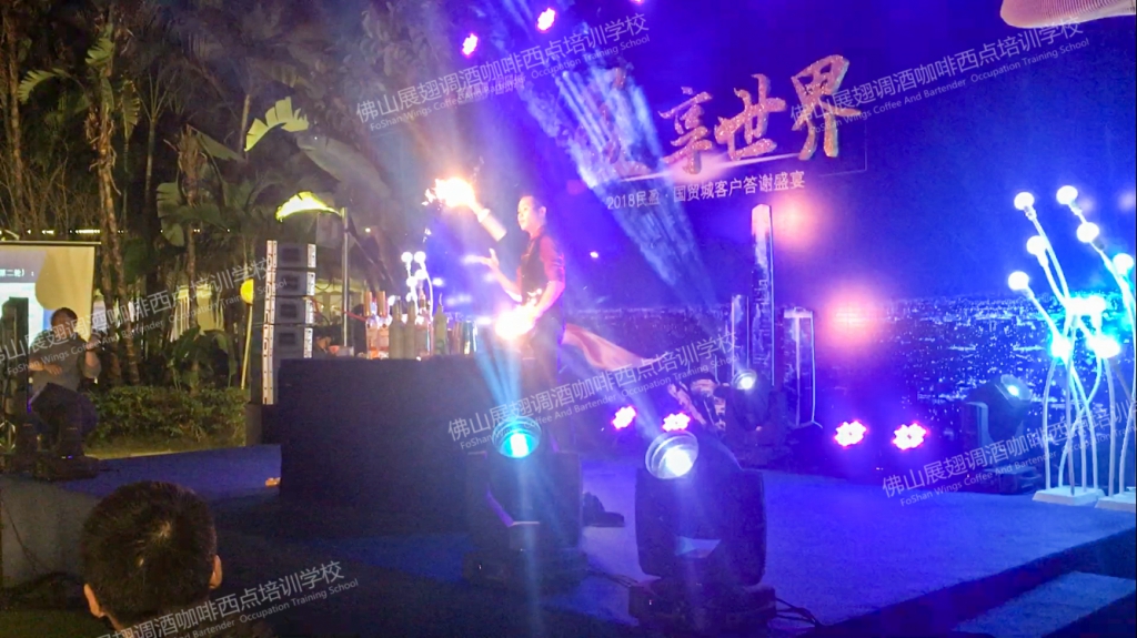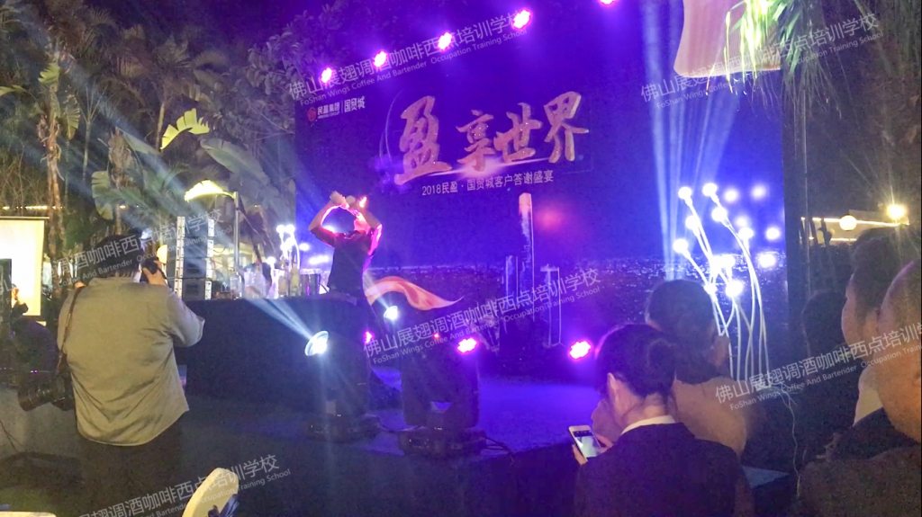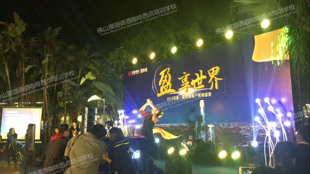 2018年1月19日,“盈·享世界”2018民盈·國貿城客戶答謝宴在水濂山依維薩戶外西餐廳隆重舉行。佛山展翅調酒咖啡西點培訓學校的調酒師應邀參加了此次答謝宴并為現場帶來一場精彩的花式調酒表演。讓我們一起回顧一下現場的精彩表演吧。