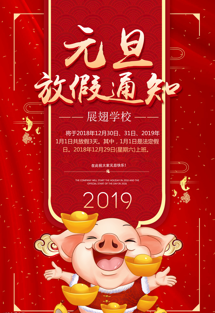 根據我校“元旦”放假安排,“元旦”放假時間為:2018年12月30日(周日)——2019年1月1日(周二)共三天,2018年12月29日(星期六)上班。期間所有班級不上課,您可登陸官網站在線咨詢,或咨詢相關微信號公眾號!在此提醒各位學員:請按照課表進行上課,合理安排假期時間!值此元旦佳節,祝大家節日愉快,闔家幸福!