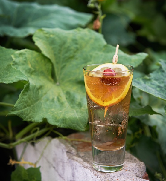 加冰搖勻,濾入加滿冰塊的高球杯中;用姜汁汽水加滿,以一片檸檬和一個(gè)櫻桃裝飾。