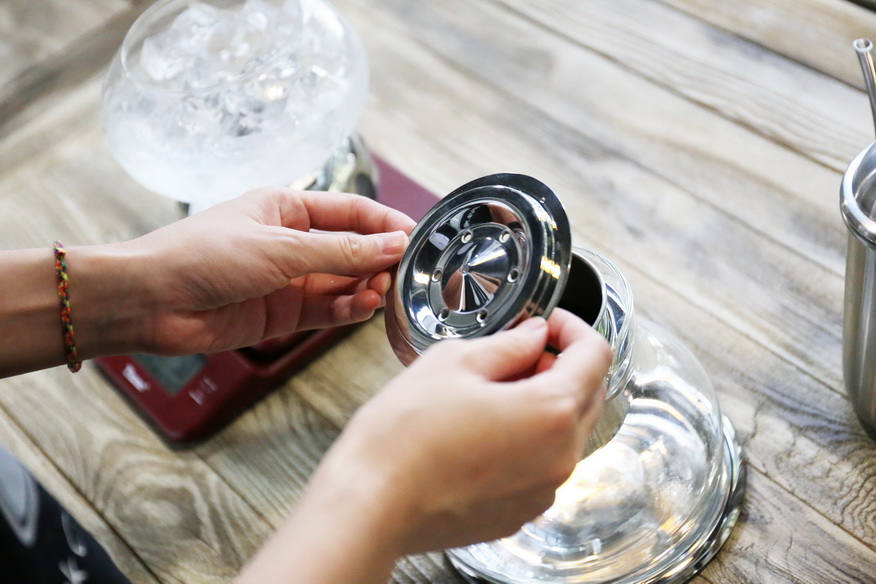 把冰滴壺組裝好。旋轉(zhuǎn)閥門桿可以調(diào)節(jié)冰水滴速。滴速過快可能造成萃取不足,缺乏風(fēng)味。過慢會造成萃取過度,可能導(dǎo)致苦味和澀味的出現(xiàn)。這次我們用的滴速是1分鐘40滴,大概3秒2滴。