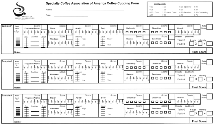 專業的機構SCAA(美國精品咖啡協會)和 COE(Cup of Exellence,中文譯文為“超凡一杯”或“卓越杯”)的杯測表更為細致一些,除了上面提到的濕香、醇厚度、風味、酸度、甜度、后味以外,還要分別對“干香” (Fragrance)、 “一致性”(uniformity)、“干凈度”(clean cup)、“口感” (mouth feel)、“整體印象”(overall)、“污點(taint)”、“缺陷”(fault)等項評價打分。